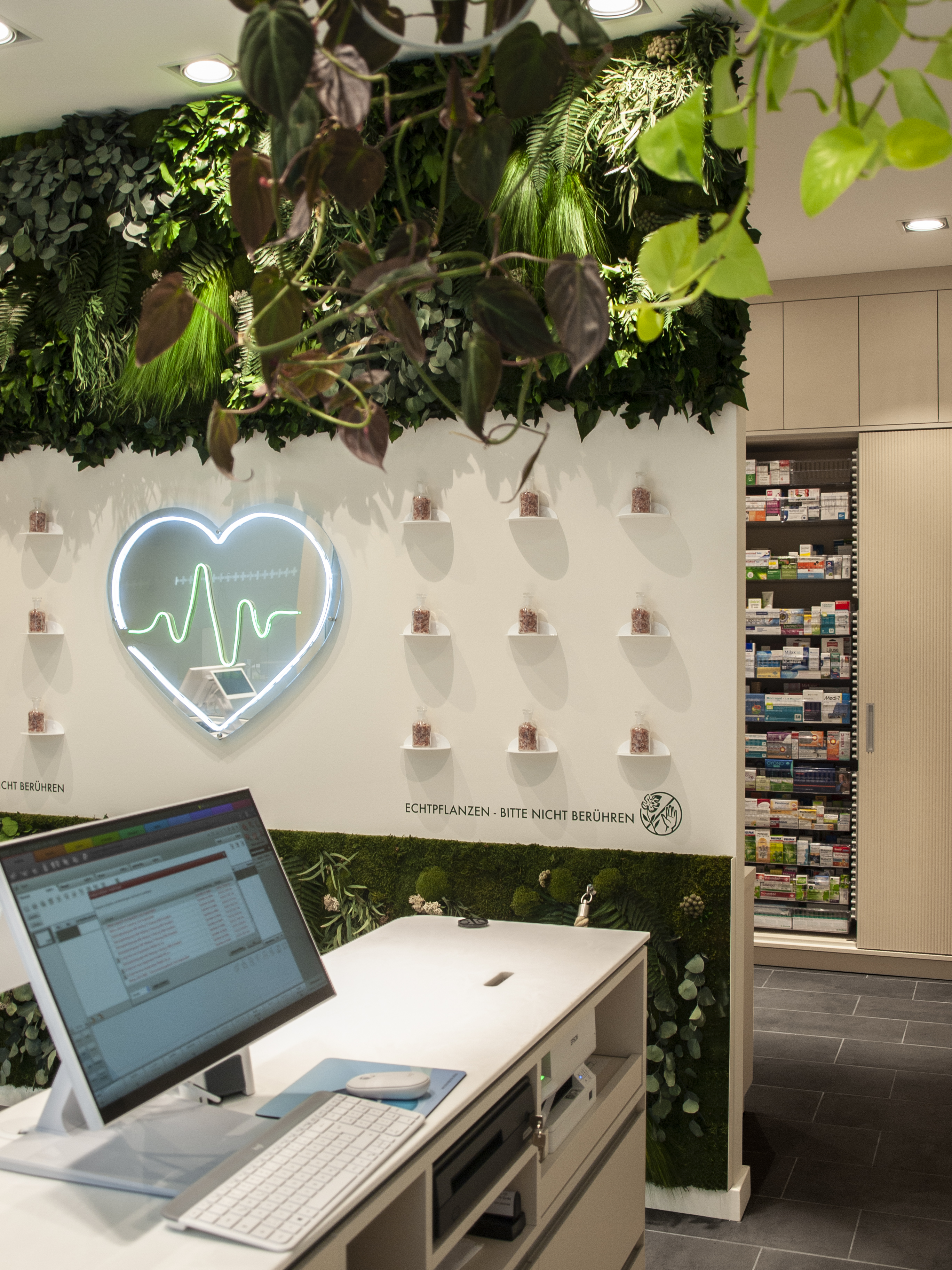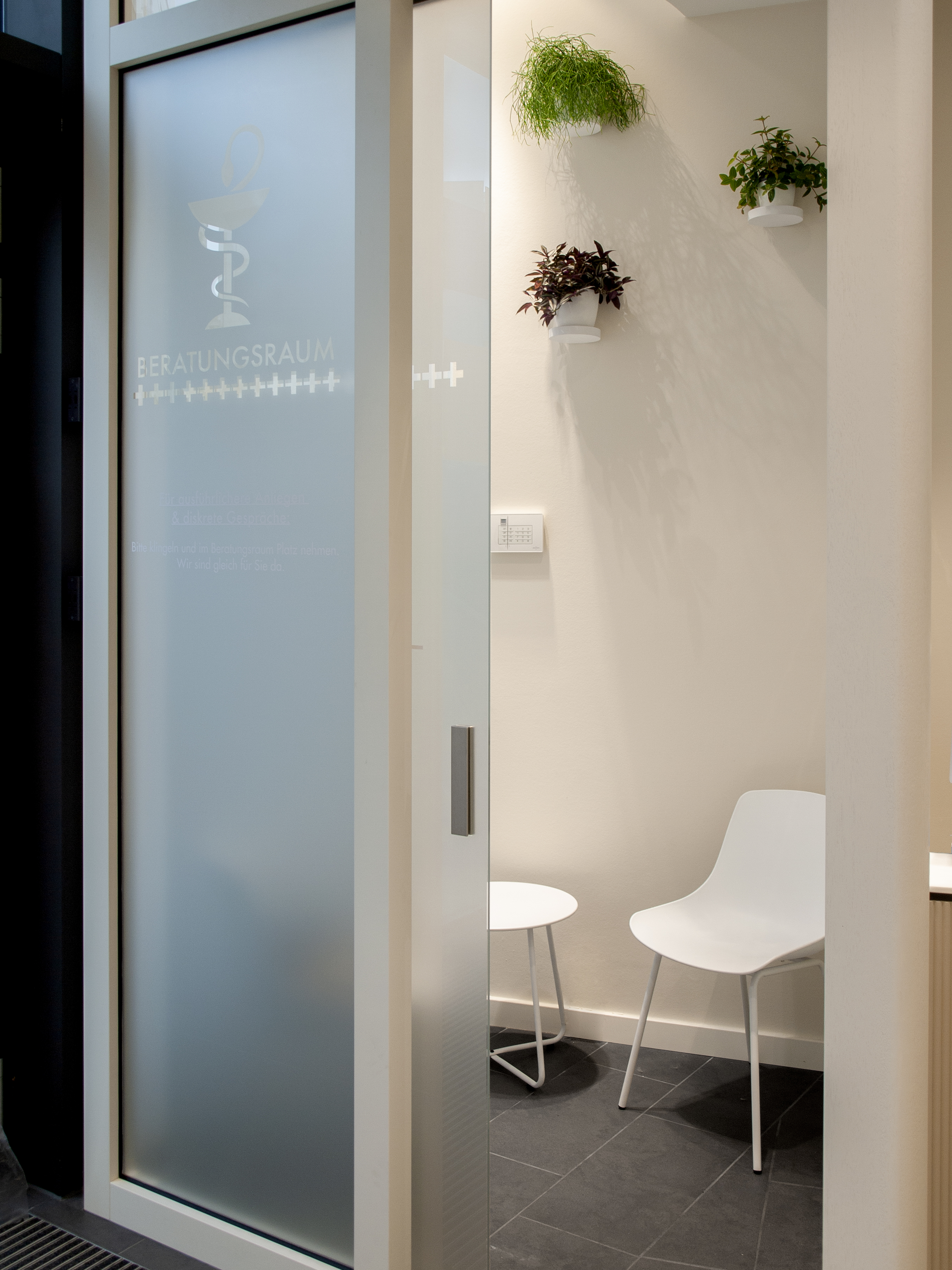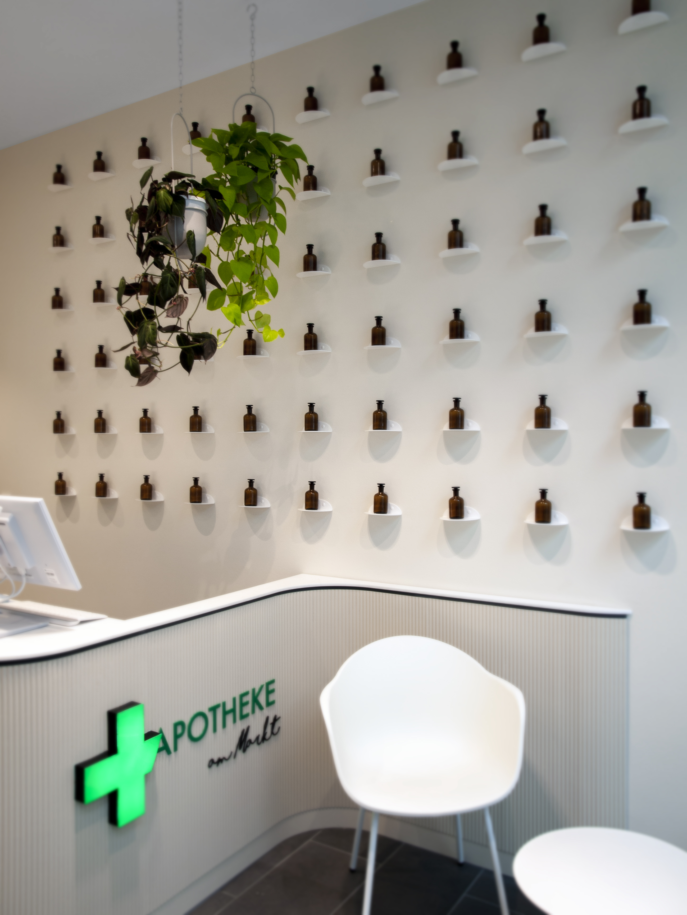 Ziel war es, einen Raum zu entwickeln, der pharmazeutische Kompetenz sichtbar macht, ohne sie durch markengebundene