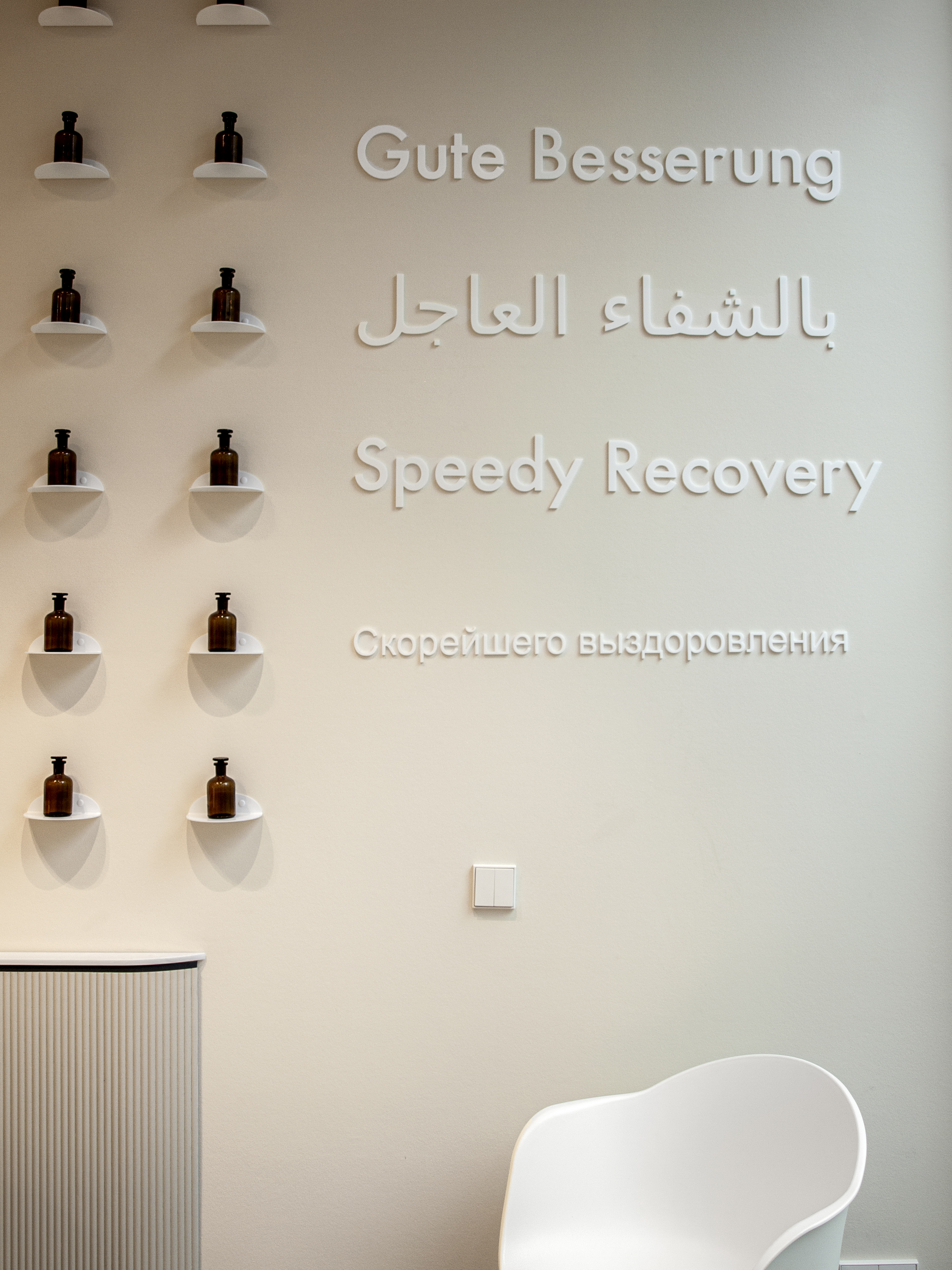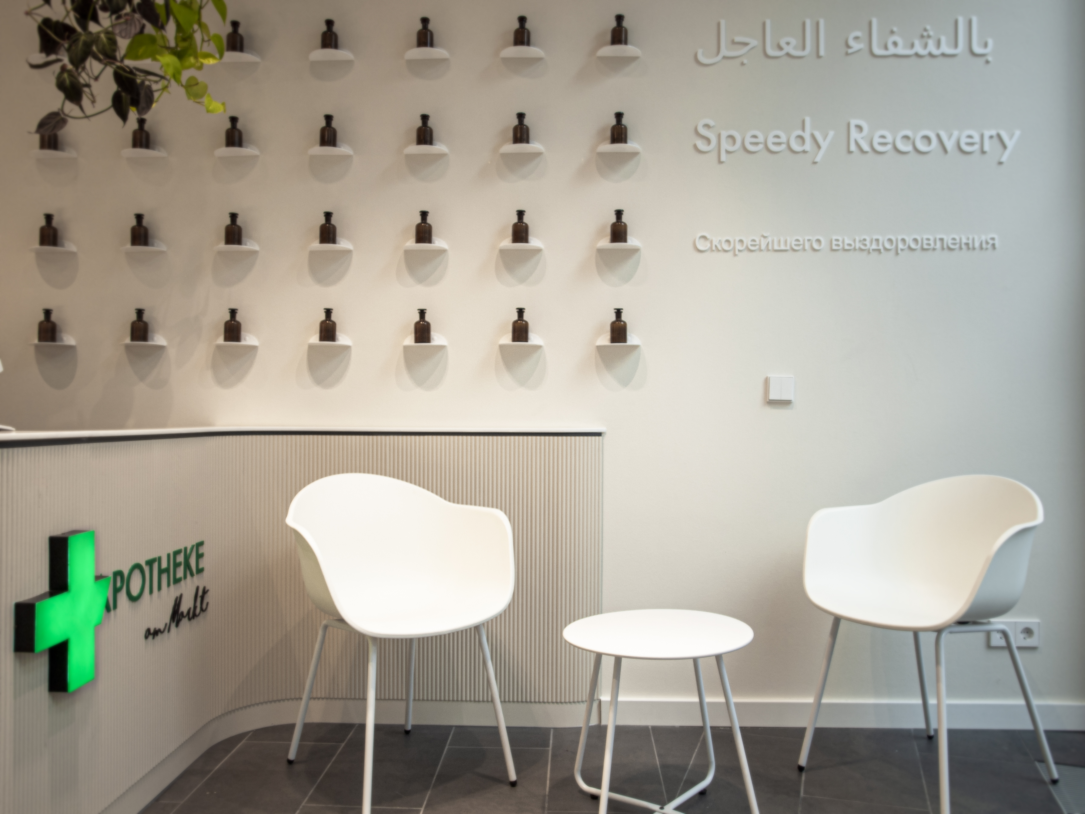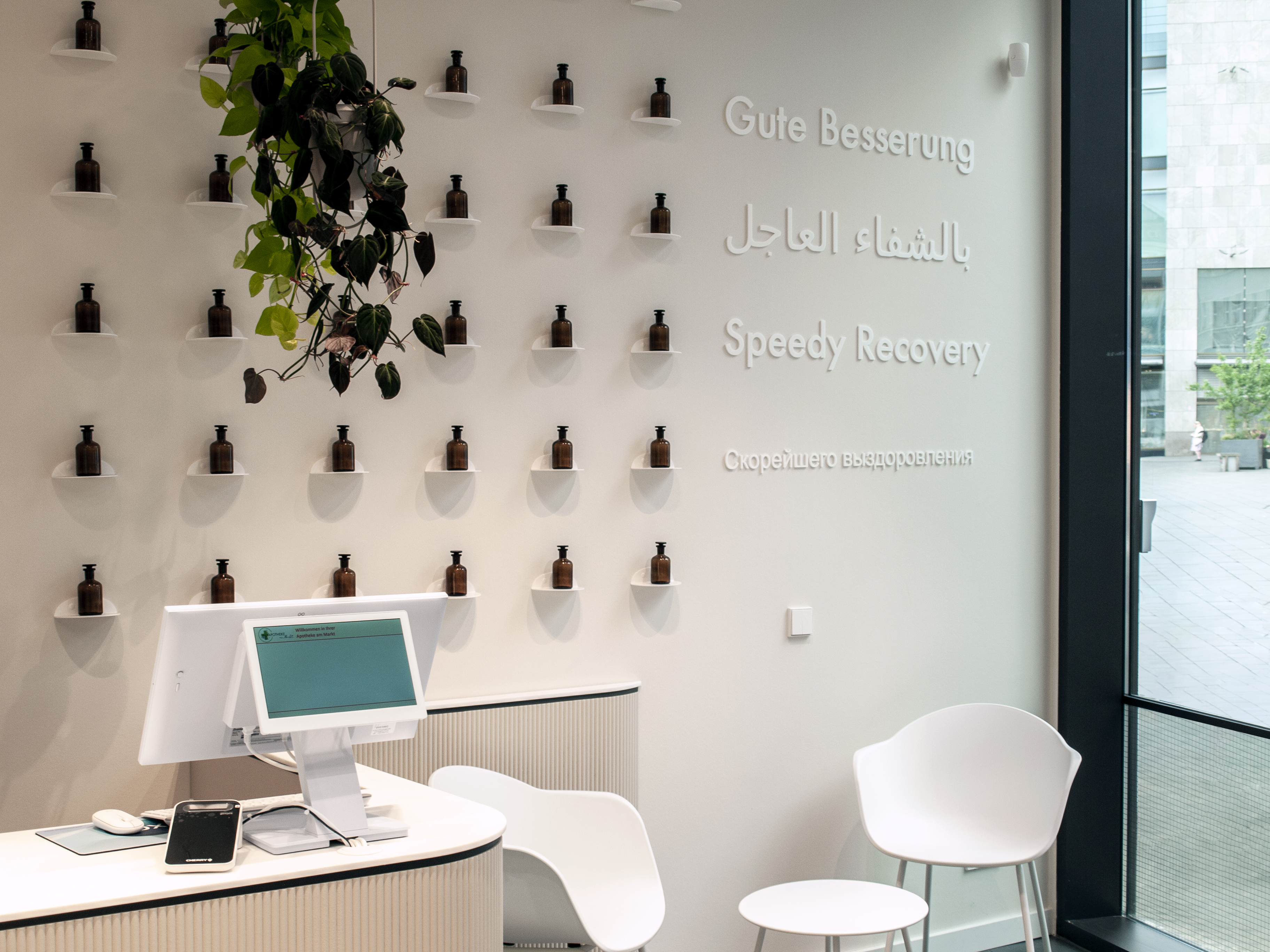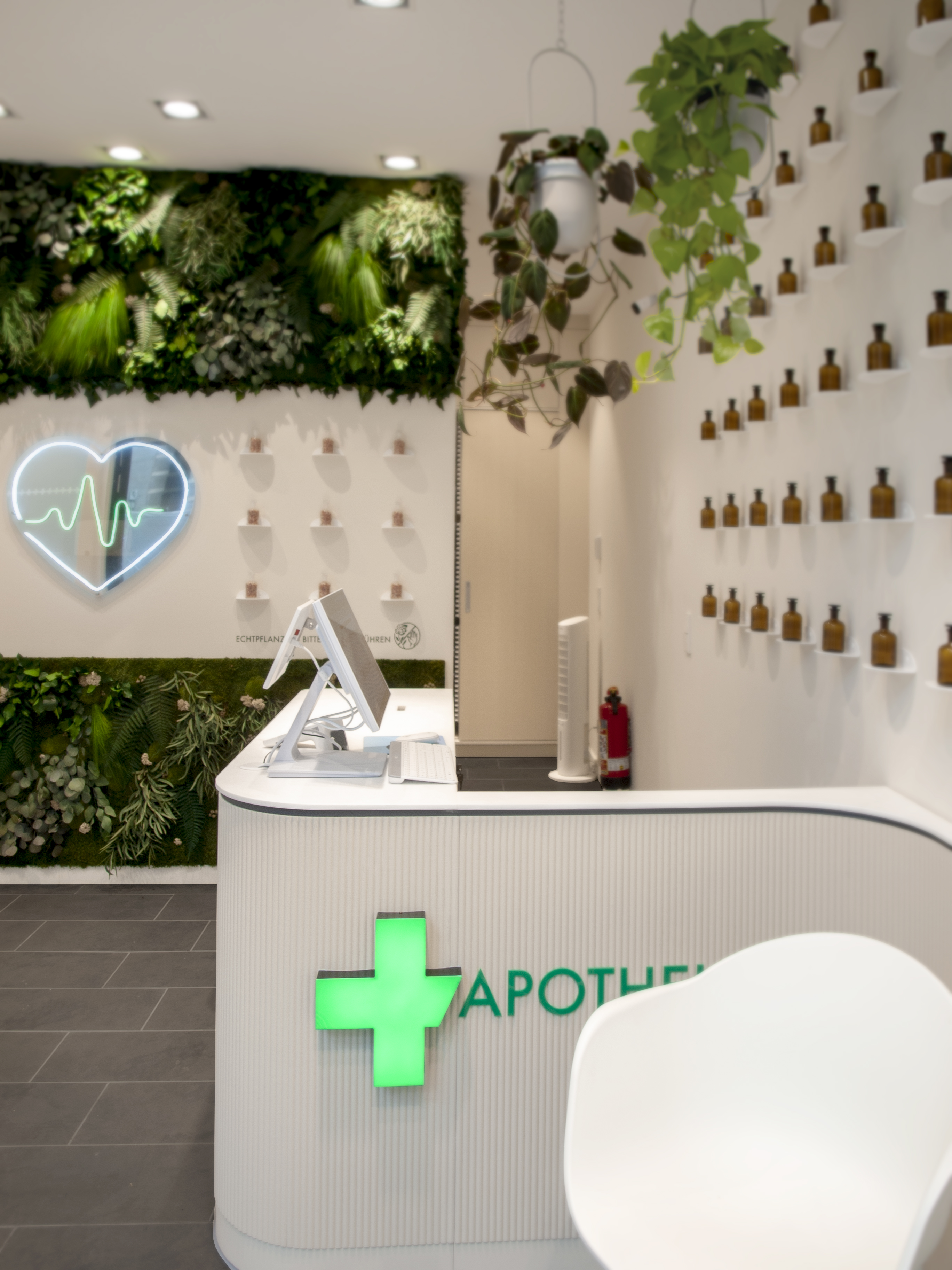 Ziel war es, einen Raum zu entwickeln, der pharmazeutische Kompetenz sichtbar macht, ohne sie durch markengebundene