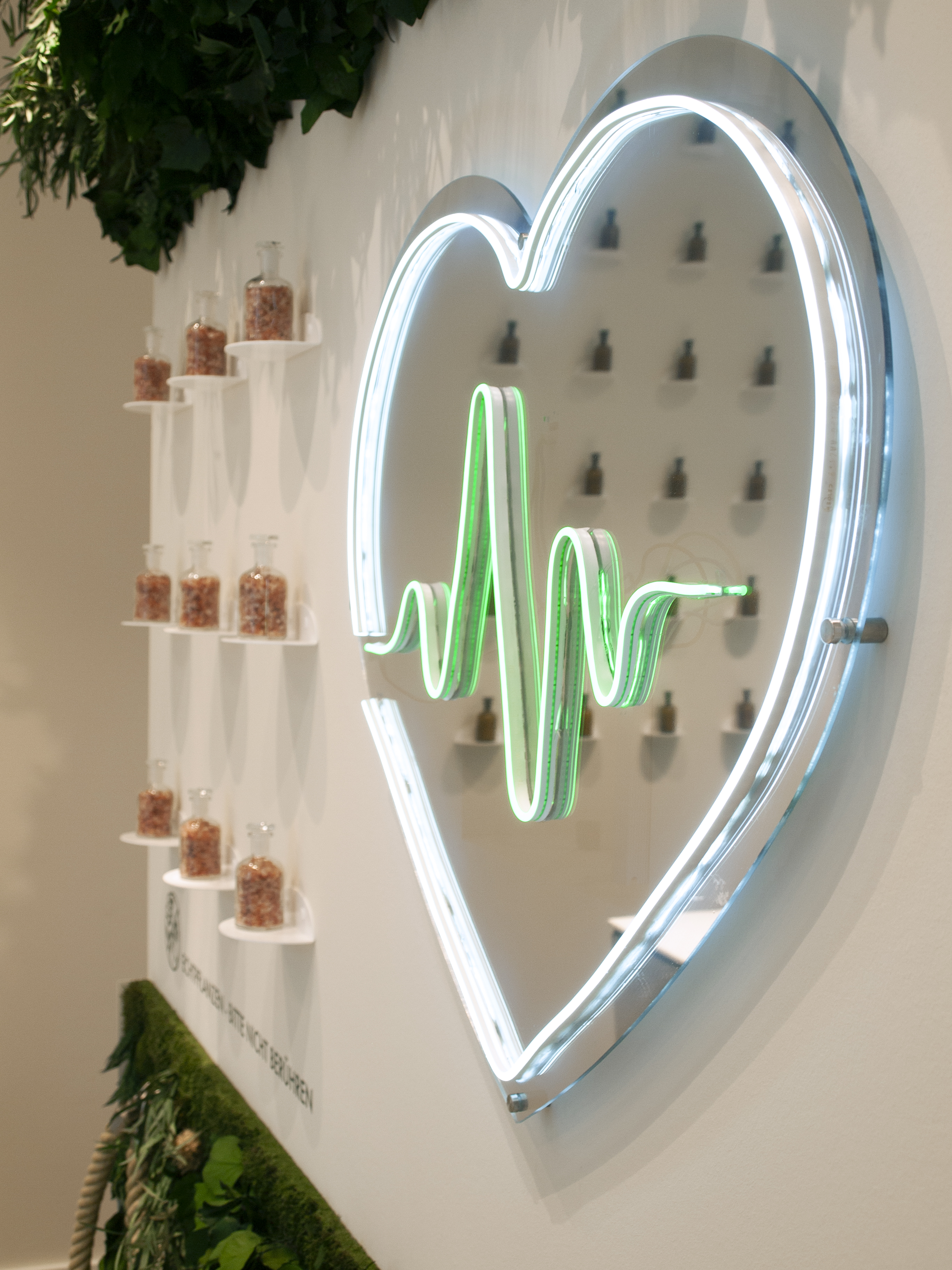 Ein zentrales gestalterisches Element ist die Integration lebender Pflanzen. Die vertikale Begrünung fungiert nicht als bloßes Atmosphäreelement, sondern als bewusst gesetzter Ausgleich zur technischen und funktionalen Umgebung. Sie wirkt raumklimatisch regulierend, visuell beruhigend und verleiht dem Raum eine zusätzliche sensorische Ebene, in der Gesundheit nicht thematisiert, sondern erfahrbar wird.