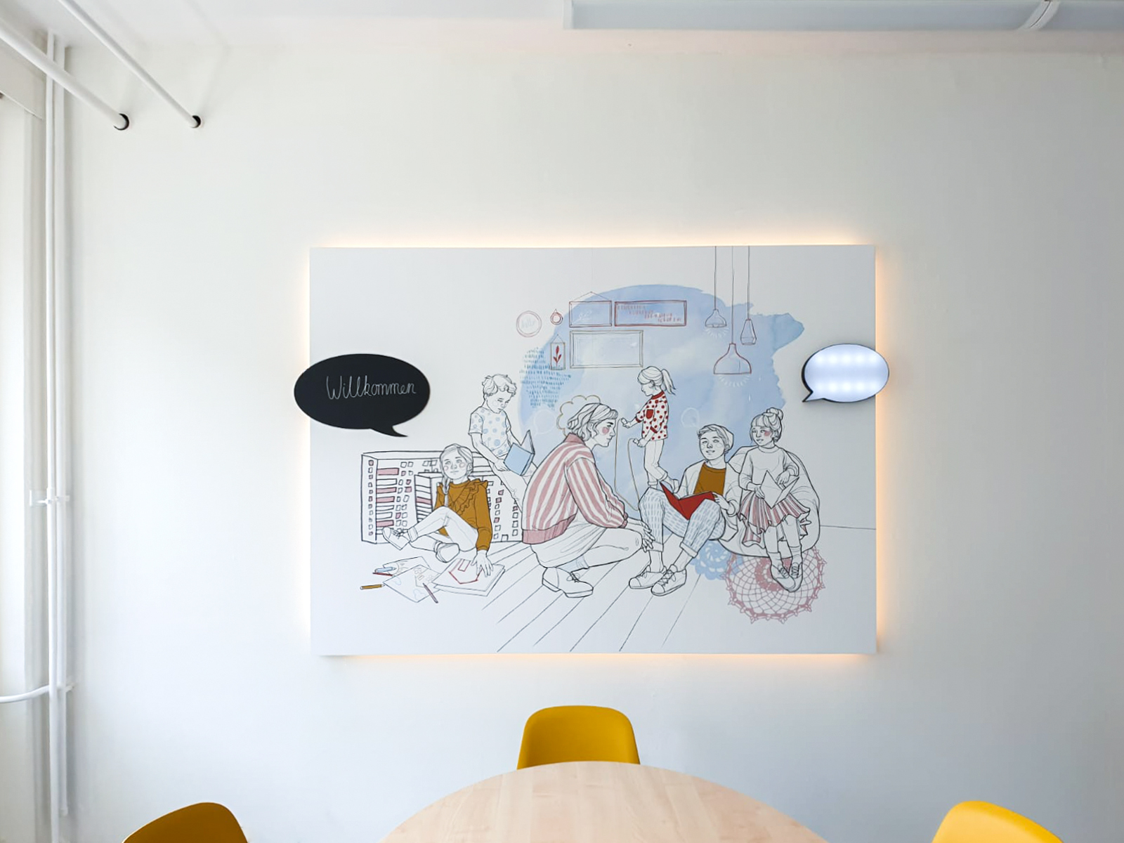 Im Kontext oftmals sehr bunten Spielzeuges und Alltagsgegenständen, wurde sich hier bewusst für zurückhaltende Farben und Gestaltung entschieden. Gestalterisches Highlight sind die, von einer Illustratorin eigens für Dreieins erstellten Grafiken, die die Lebensrealität der Kinder abbilden.