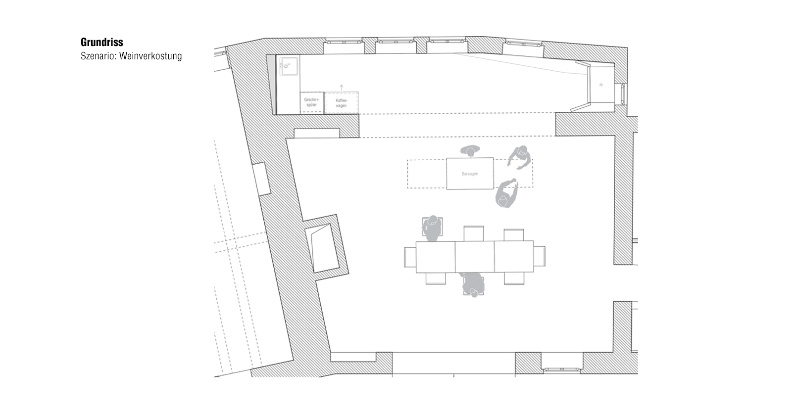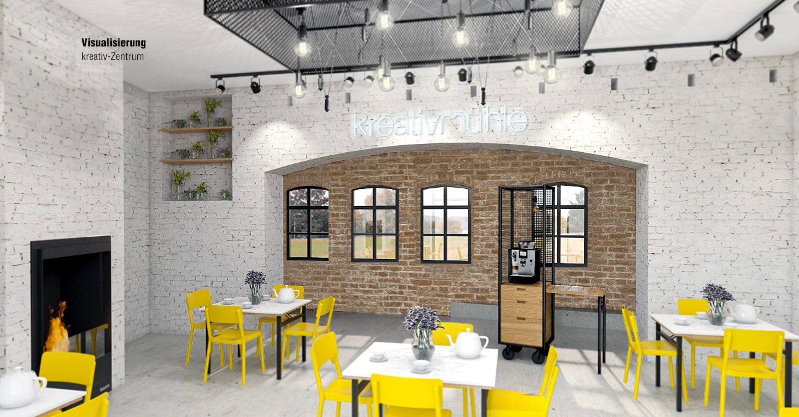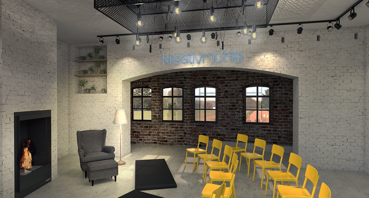 Grob gegliedert gibt es vier Felder in denen sich die Veranstaltungen im Kreativzentrum bewegen werden: Bildung, Kreativangebote, Café & Lounge, sowie Märkte. Ziel war es für diese vielfältige Nutzung ein multifunktionales Raumkonzept zu erarbeiten und dabei den Altbestand zu würdigen. Das Konzept sieht vor, die vorhandene Substanz minimal aufzuwerten um den alten Charme beizubehalten, dazu werden die Wände im mit der Zeit gewachsenen, unregelmäßigen Mauerwerk belassen und lediglich ausgebessert.