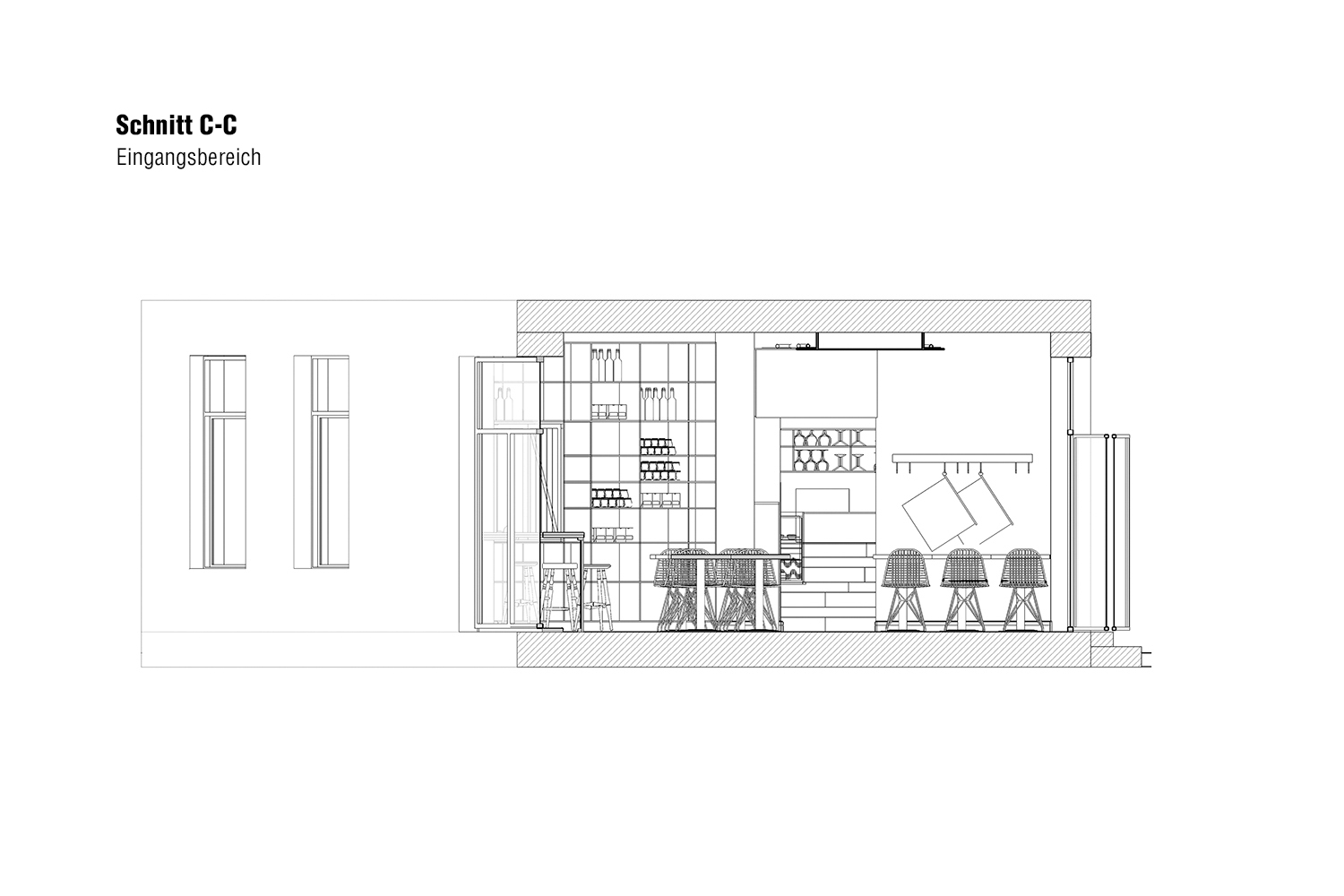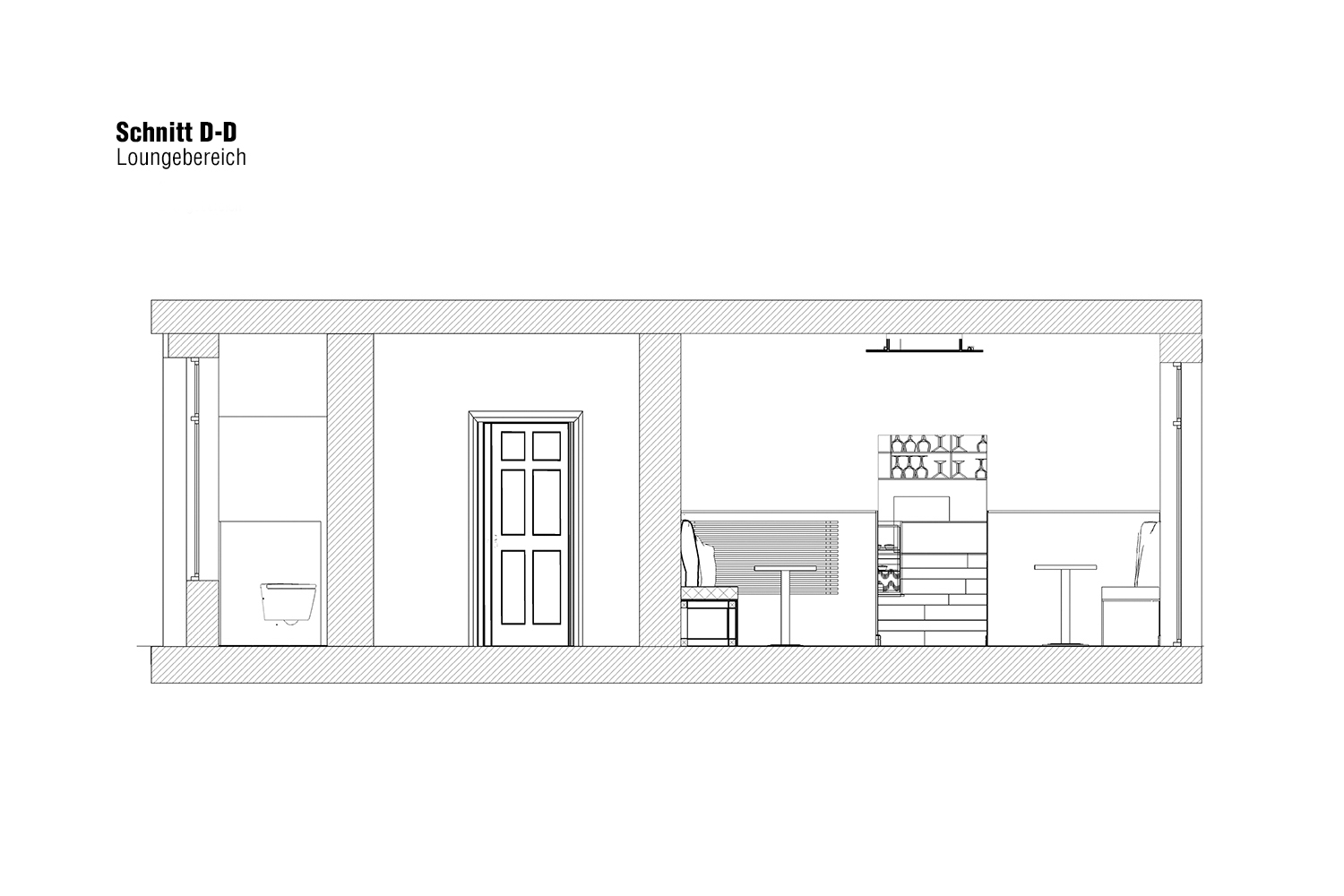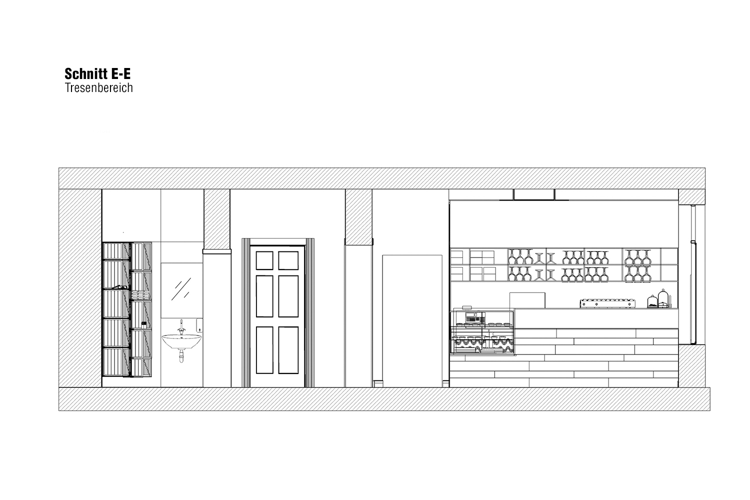 Um den Tresen im hintersten Raum in den Fokus des Gastes zu lenken, wird die Flucht vom Eingang zum Tresen durch ein beleuchtetes Deckenpaneel betont. Dieses hebt sich zusätzlich durch sein strahlendes weiß von der sonst komplett grau-beigen Wand- und Deckenfarbe ab