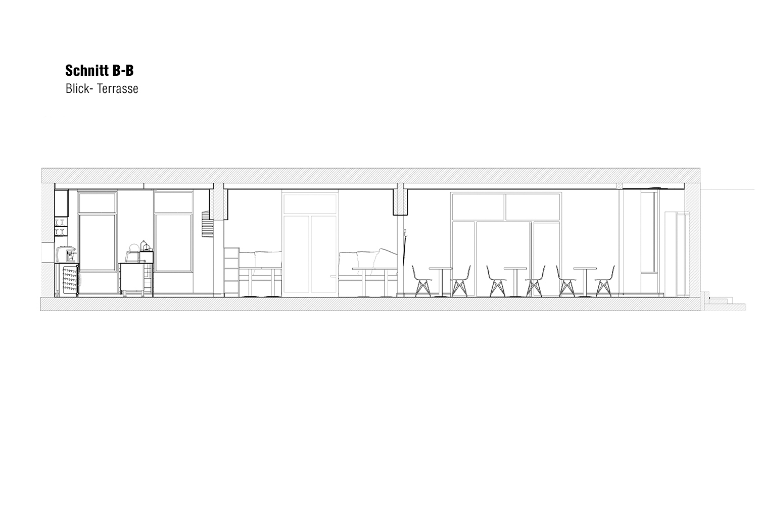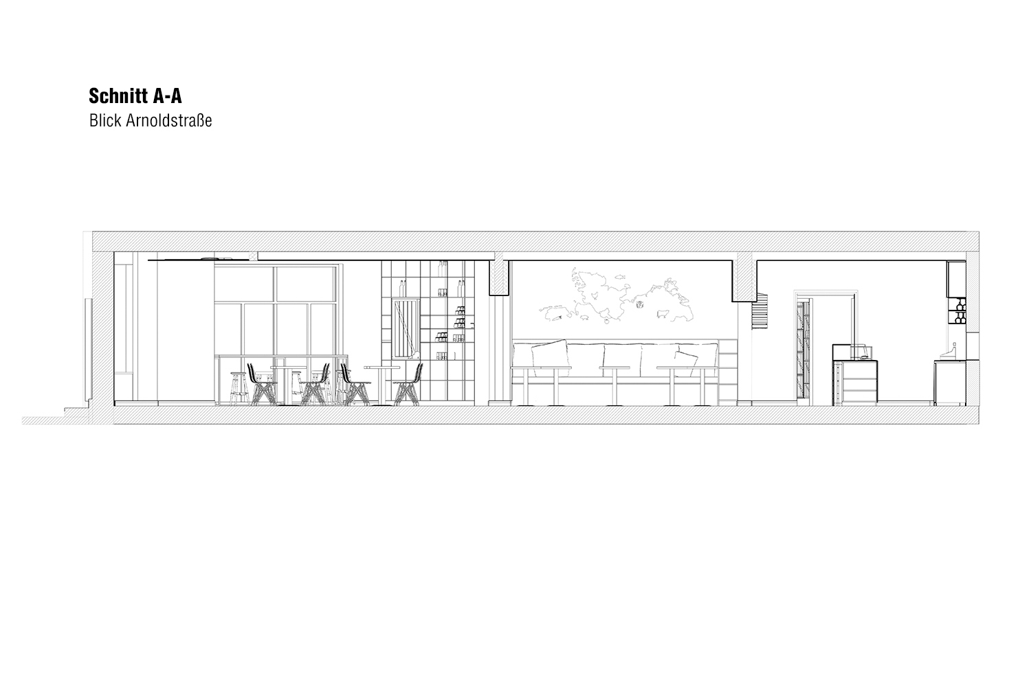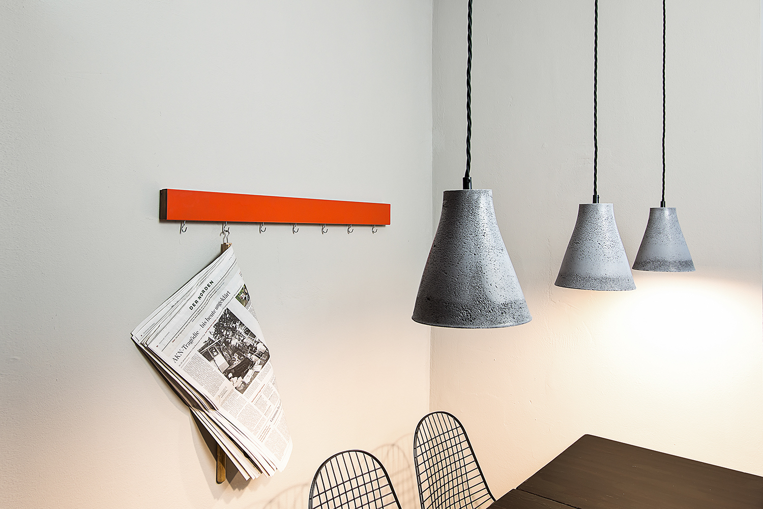 Um den Tresen im hintersten Raum in den Fokus des Gastes zu lenken, wird die Flucht vom Eingang zum Tresen durch ein beleuchtetes Deckenpaneel betont. Dieses hebt sich zusätzlich durch sein strahlendes weiß von der sonst komplett grau-beigen Wand- und Deckenfarbe ab